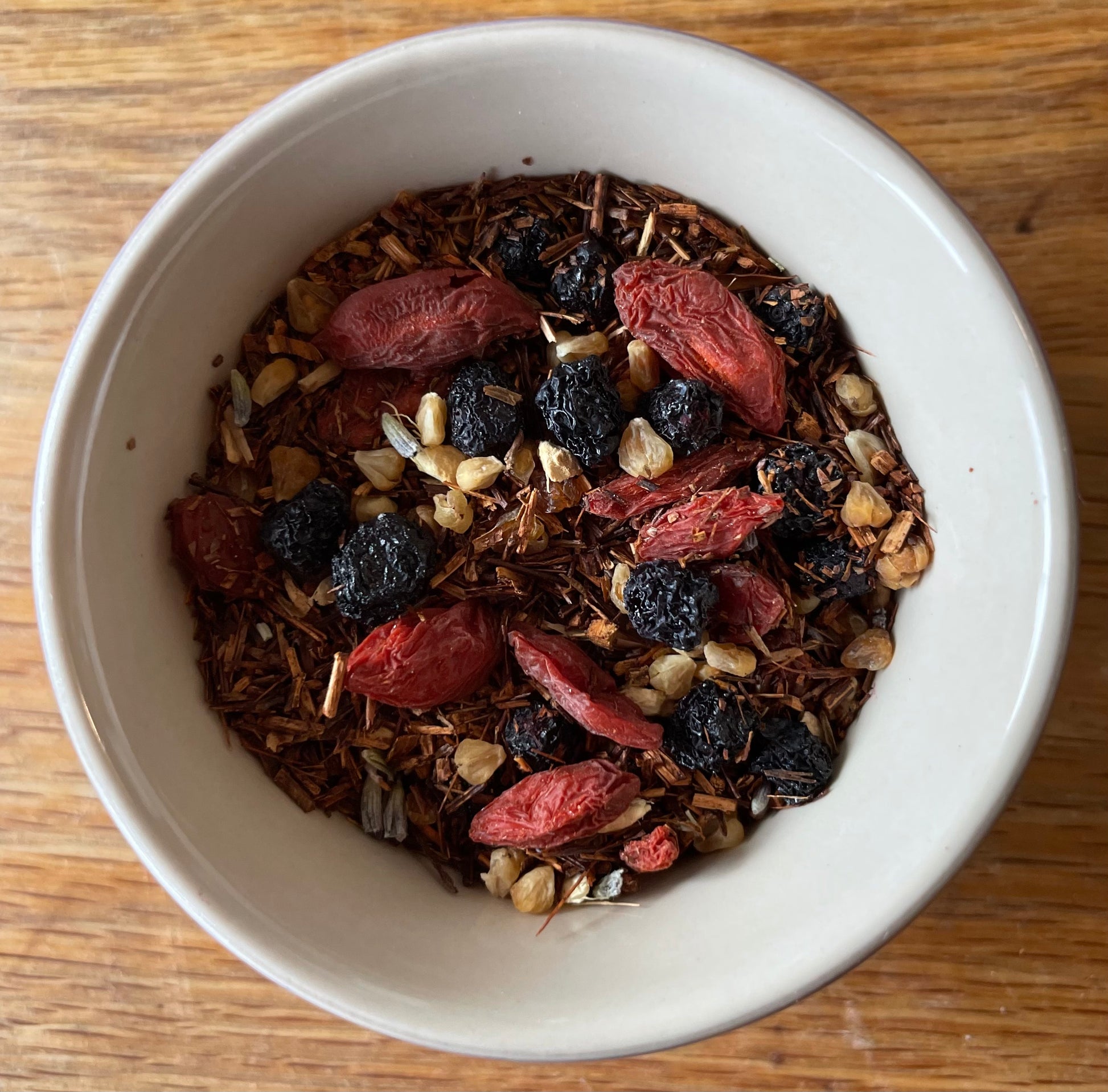 LYRA combines floral lavender, sweet and tart berries (goji, aronia, white berries), smooth rooibos, and a gentle warming note of ginger.